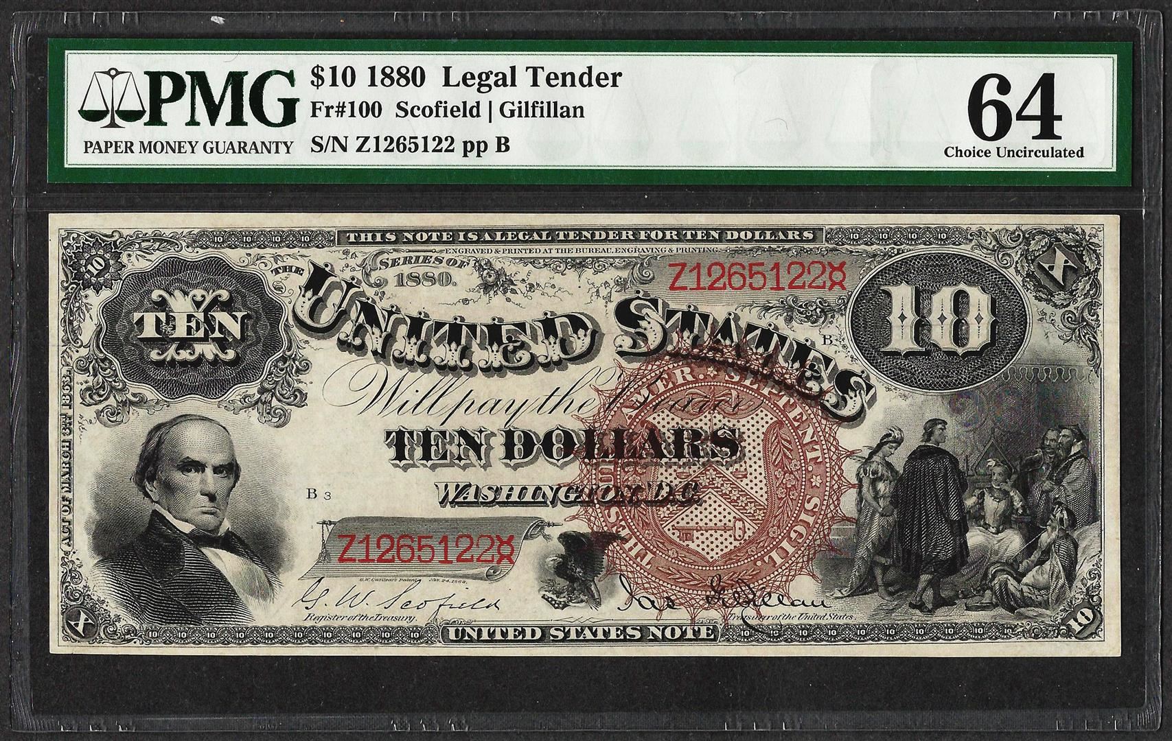 One 1880 $10 Jackass Legal Tender Note Fr.100 PMG Choice Uncirculated 64. PMG Certified.