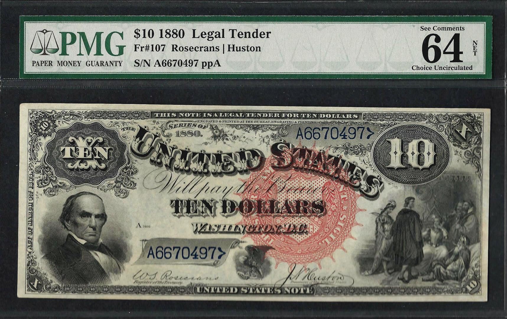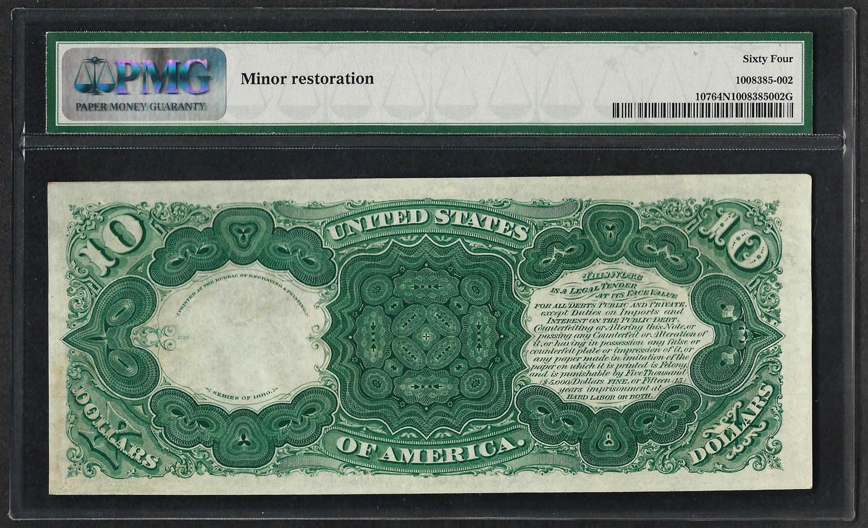 One 1880 $10 Jackass Legal Tender Note Fr.107 PMG Choice Uncirculated 64 Net. PMG Certified.