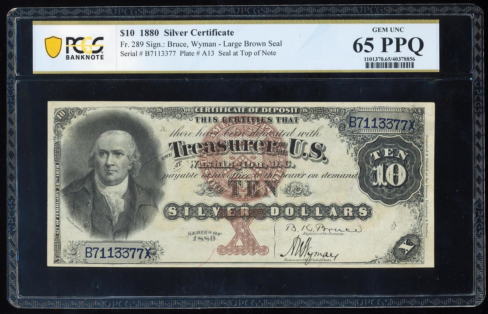 One 1880 $10 Silver Certificate Note Fr.289 PCGS Gem Uncirculated 65PPQ. PCGS Graded.