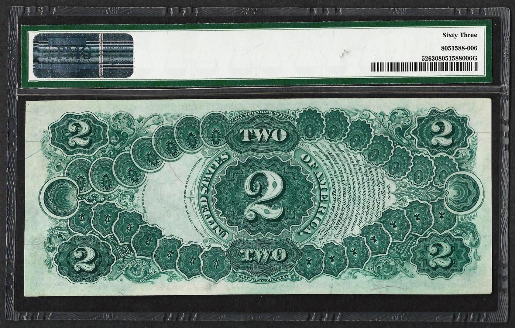 One 1880 $2 Legal Tender Note Fr.52 PMG Choice Uncirculated 63. PMG Certified.