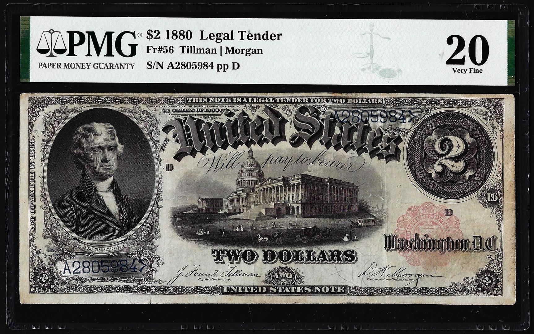One 1880 $2 Legal Tender Note Fr.56 PMG Very Fine 20. PMG Certified.