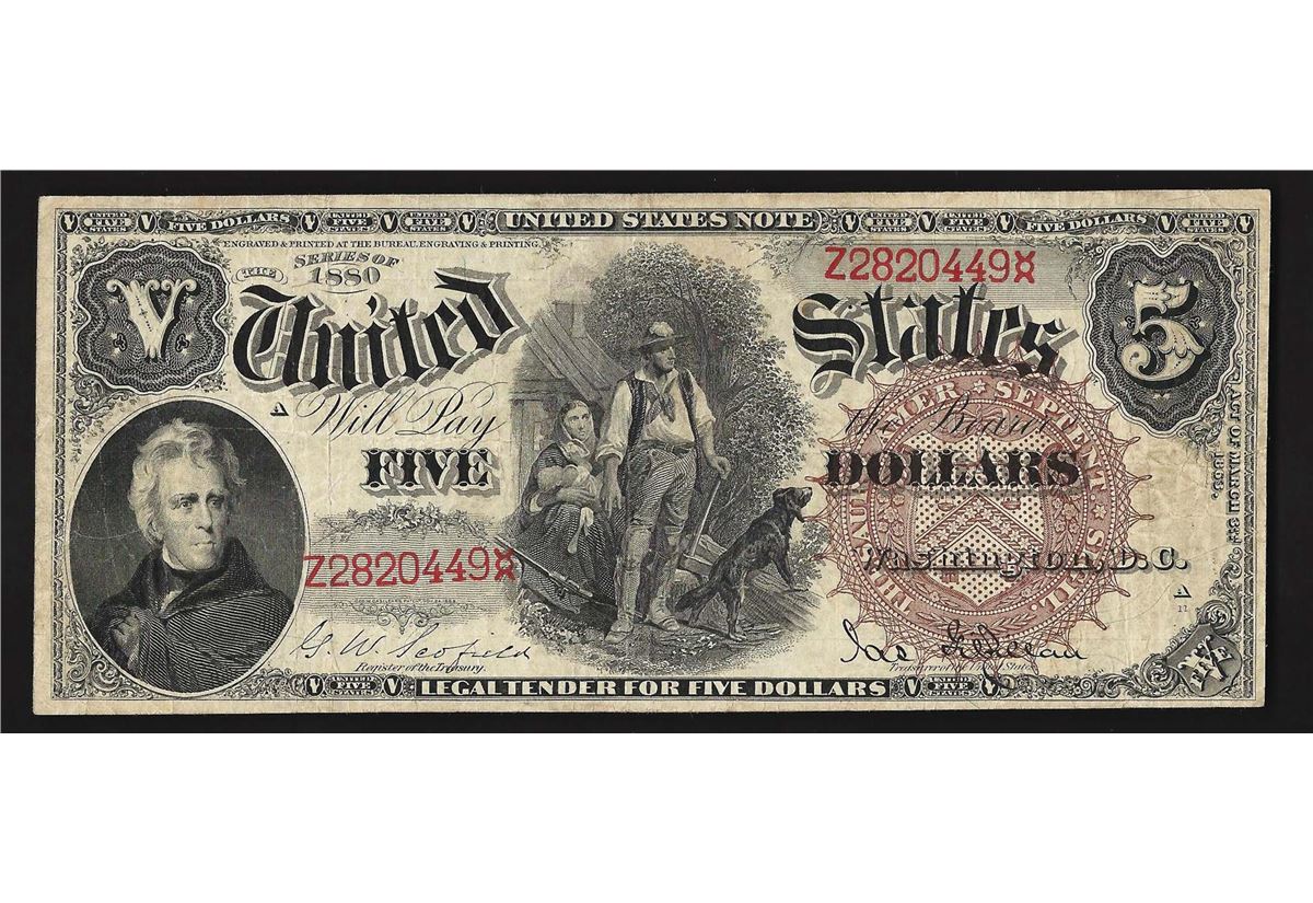 One 1880 $5 Legal Tender Woodchopper Note Large Brown Seal Fr. 70.