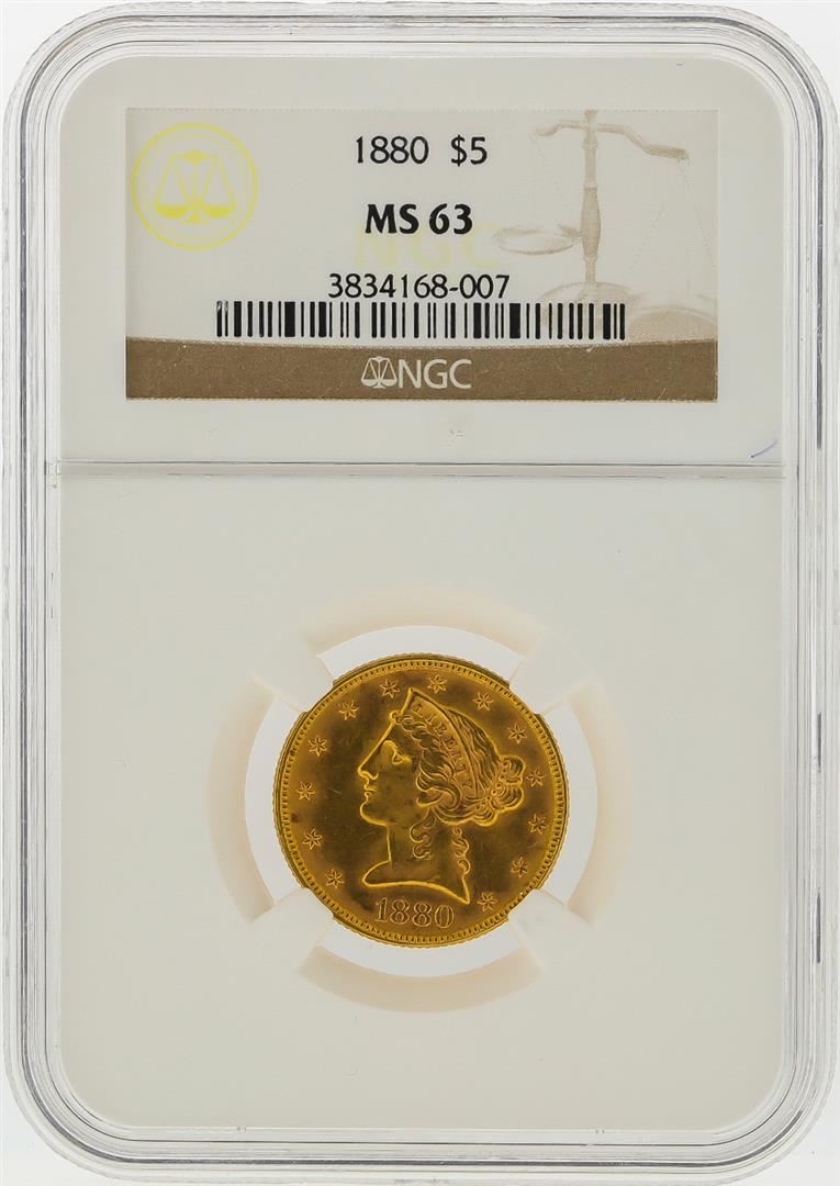 One 1880 $5 Liberty Head Half Eagle Gold Coin NGC MS63. NGC Certified.