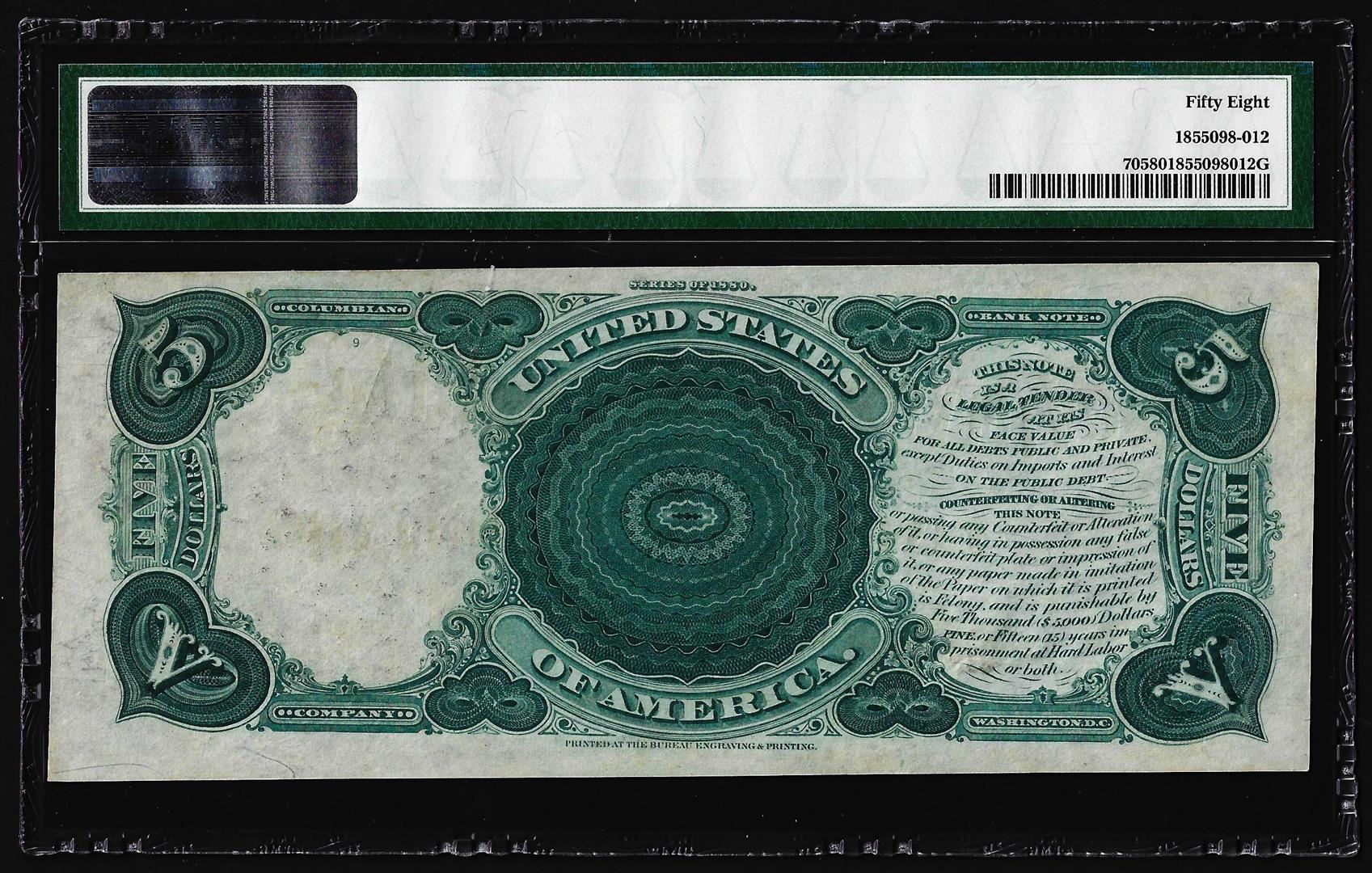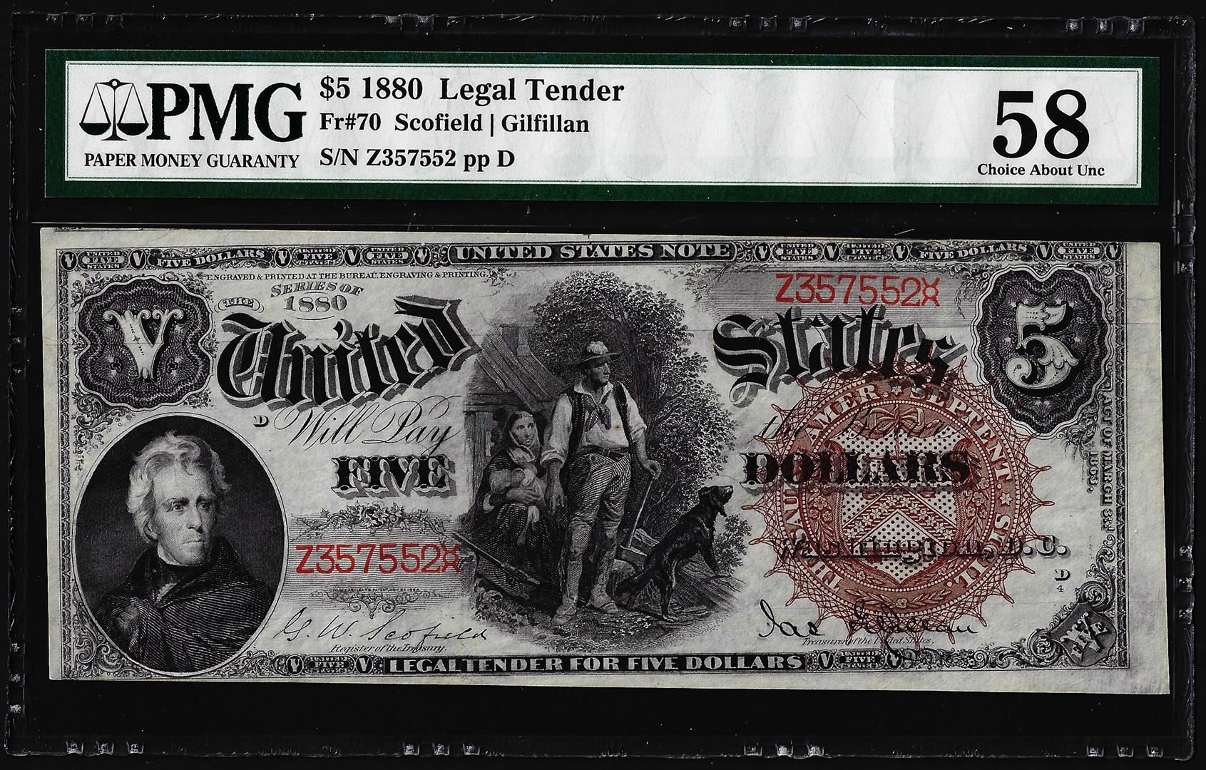 One 1880 $5 Woodchopper Legal Tender Note Fr.70 PMG About Uncirculated 58. PMG Certified.