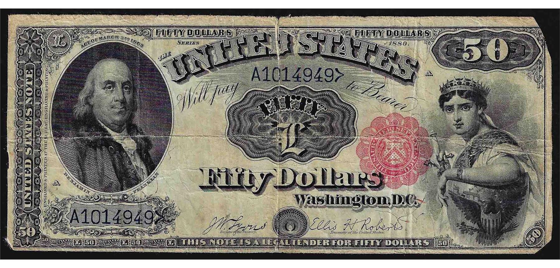 One 1880 $50 Legal Tender Note with Tear in Margin.