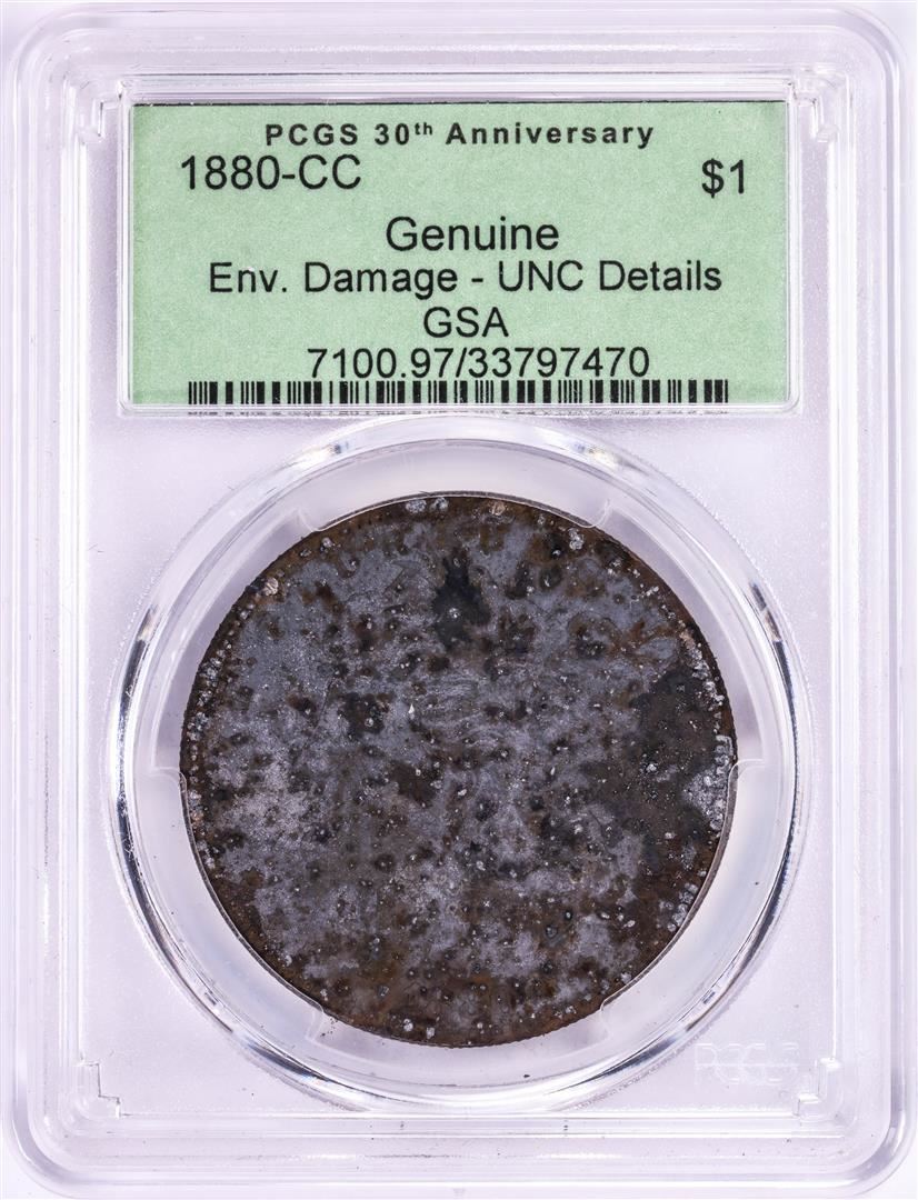One 1880-CC $1 Morgan Silver Dollar Coin PCGS Genuine Environmental Damage UNC Details. PCGS Graded.
