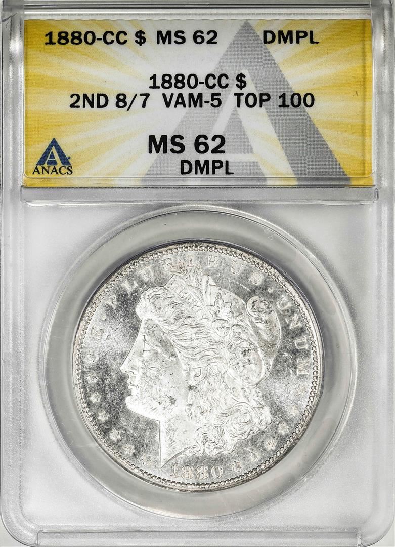 One 1880-CC 2nd 8/7 VAM-5 Top 100 $1 Morgan Silver Dollar Coin ANACS MS62 DMPL. ANACS Certified.