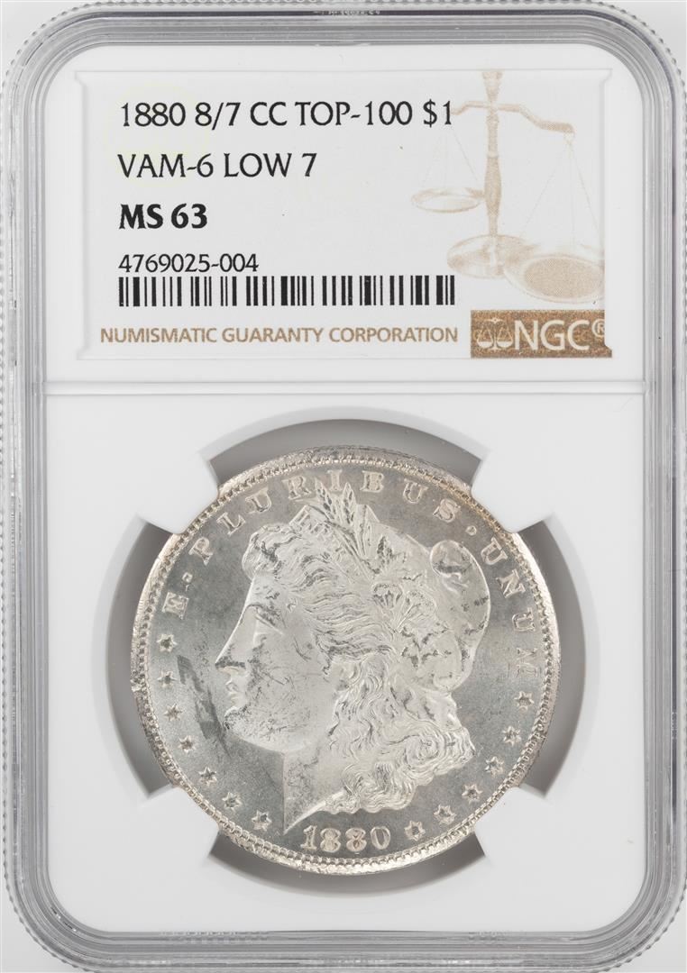 One 1880-CC 8/7 $1 Morgan Silver Dollar Coin NGC MS63 VAM-6 Low 7. NGC Certified.