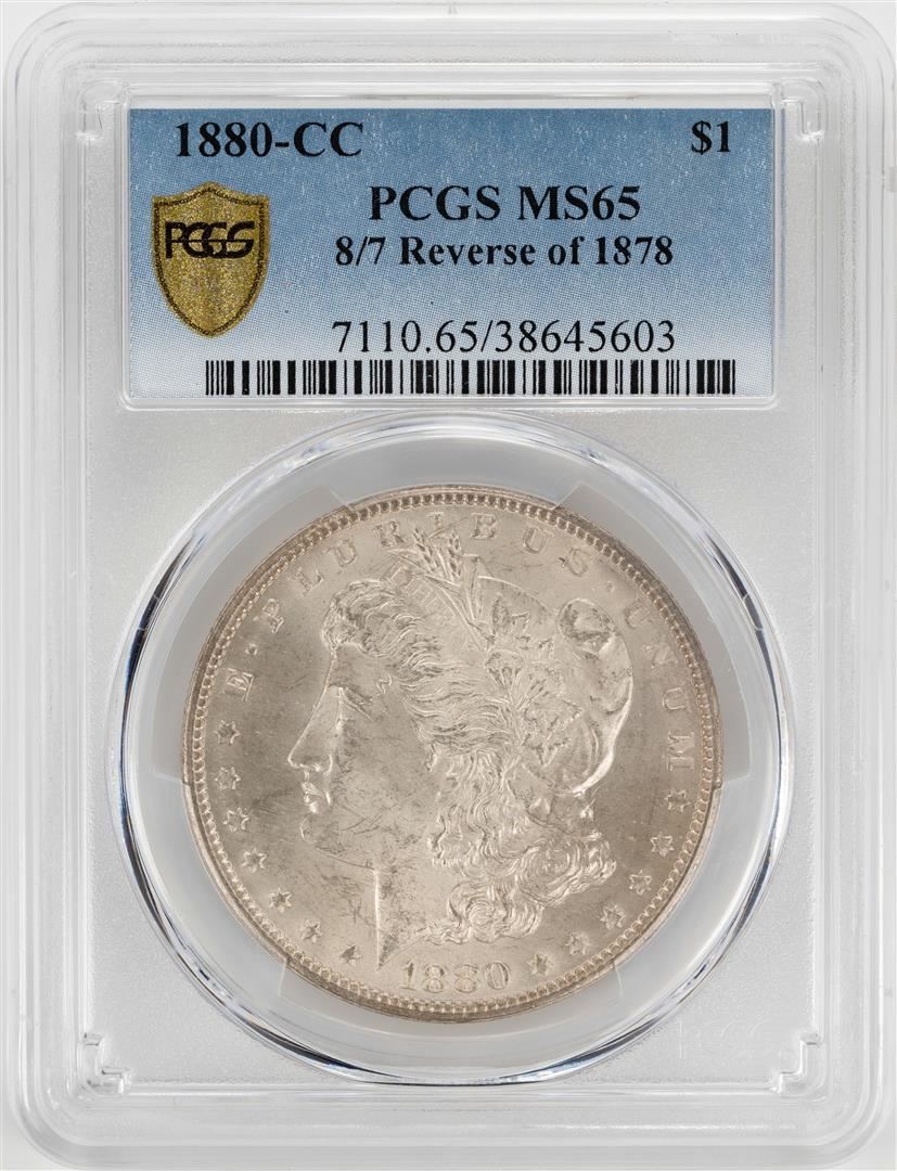 One 1880-CC 8/7 Reverse of 1878 $1 Morgan Silver Dollar Coin PCGS MS65. PCGS Graded.