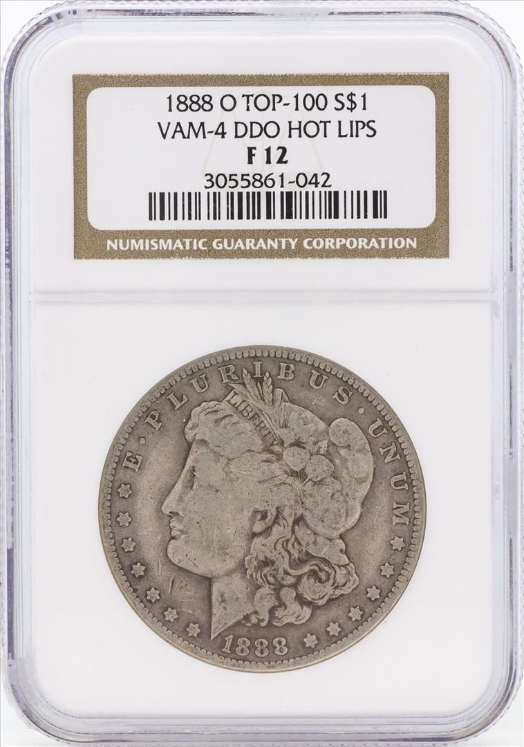 One 1880-O $1 Morgan Silver Dollar Coin VAM-4 DDO Hot Lips NGC F12. NGC Certified.