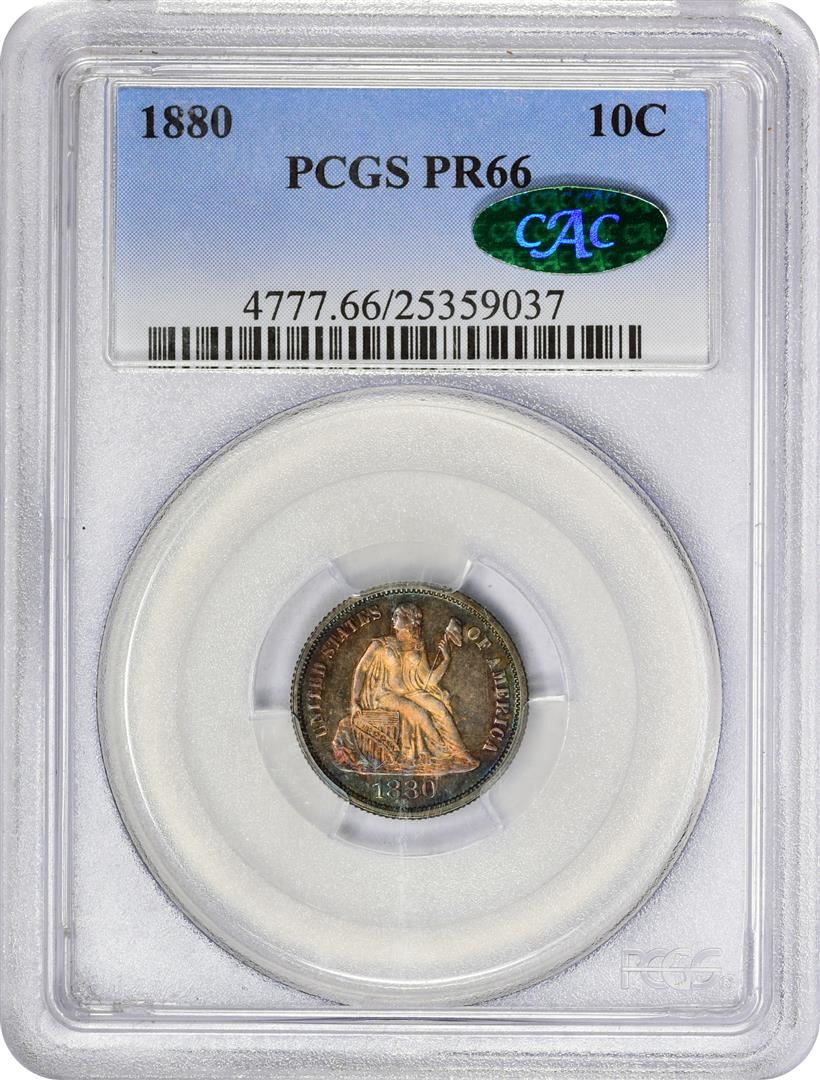 One 1880 Proof Seated Liberty Dime Coin PCGS PR66 CAC Amazing Toning. PCGS Graded.