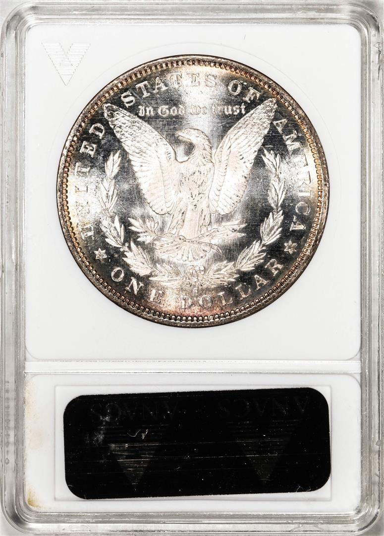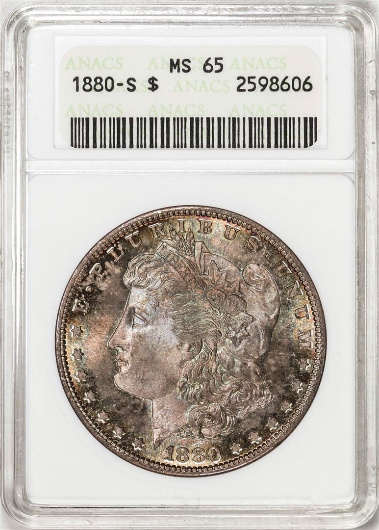 One 1880-S $1 Morgan Silver Dollar Coin ANACS MS65 Old Soap Box Holder Nice Toning. ANACS Certified.