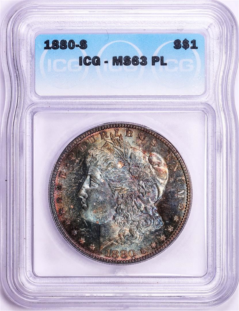 One 1880-S $1 Morgan Silver Dollar Coin ICG MS63PL Amazing Toning. ICG Certified.