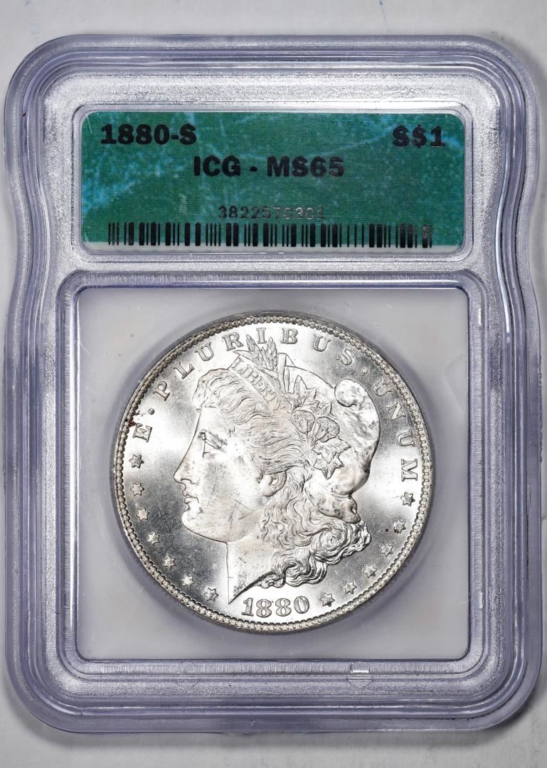 One 1880-S $1 Morgan Silver Dollar Coin ICG MS65. ICG Certified.