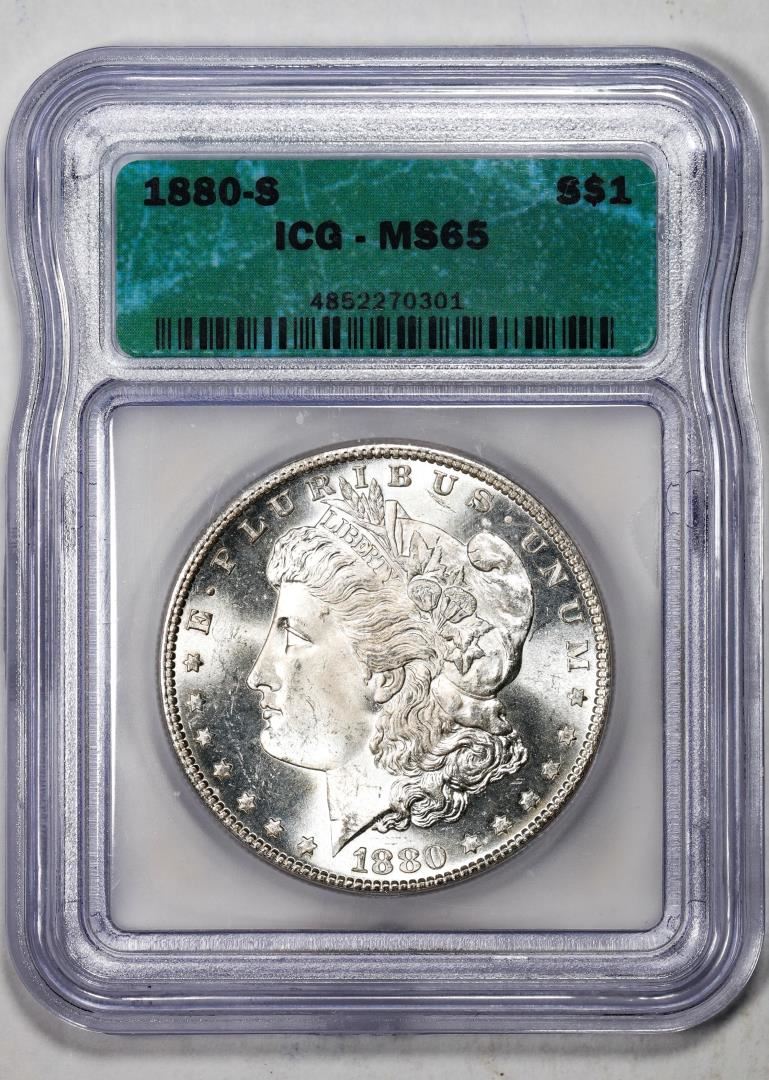 One 1880-S $1 Morgan Silver Dollar Coin ICG MS65. ICG Certified.
