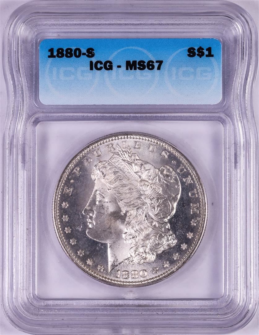 One 1880-S $1 Morgan Silver Dollar Coin ICG MS67. ICG Certified.