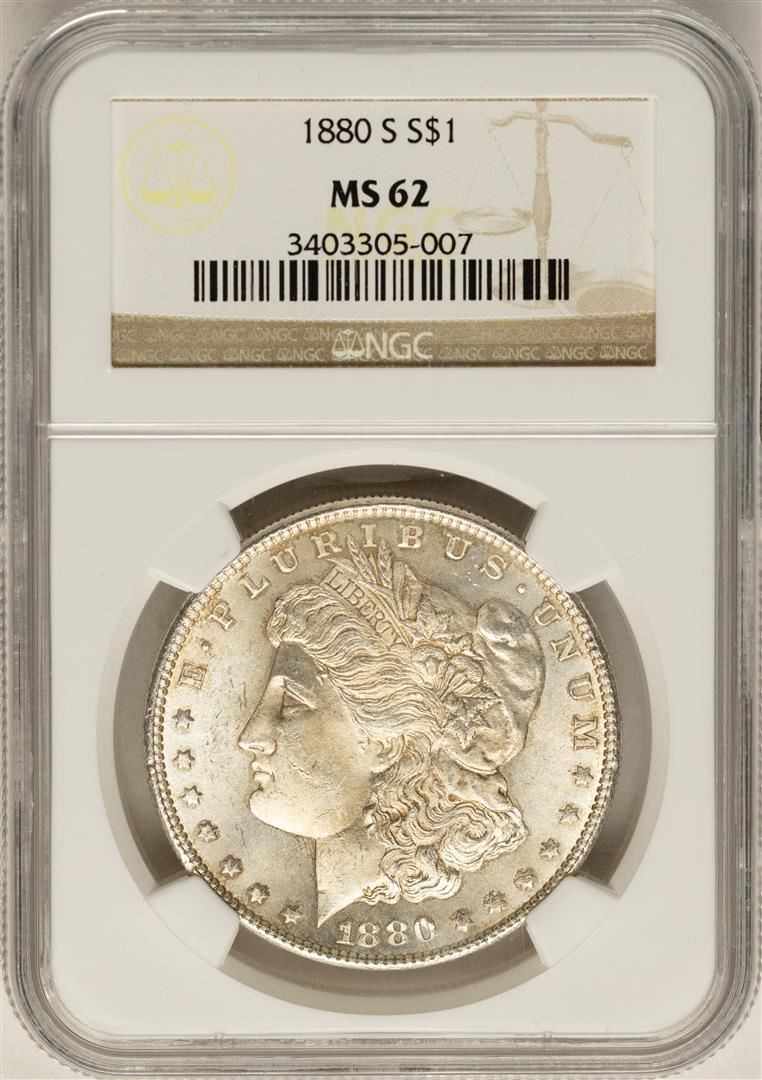 One 1880-S $1 Morgan Silver Dollar Coin NGC MS62. NGC Certified.