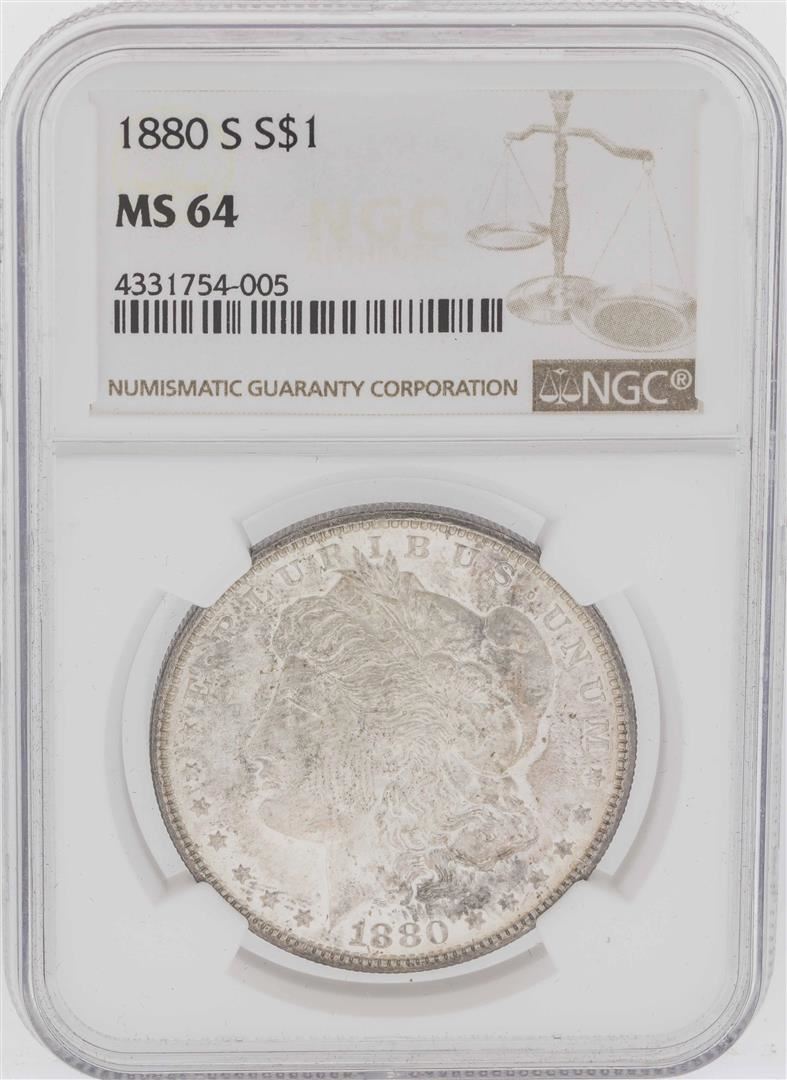 One 1880-S $1 Morgan Silver Dollar Coin NGC MS64. NGC Certified.