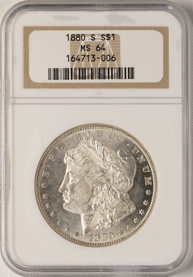 One 1880-S $1 Morgan Silver Dollar Coin NGC MS64. NGC Certified.