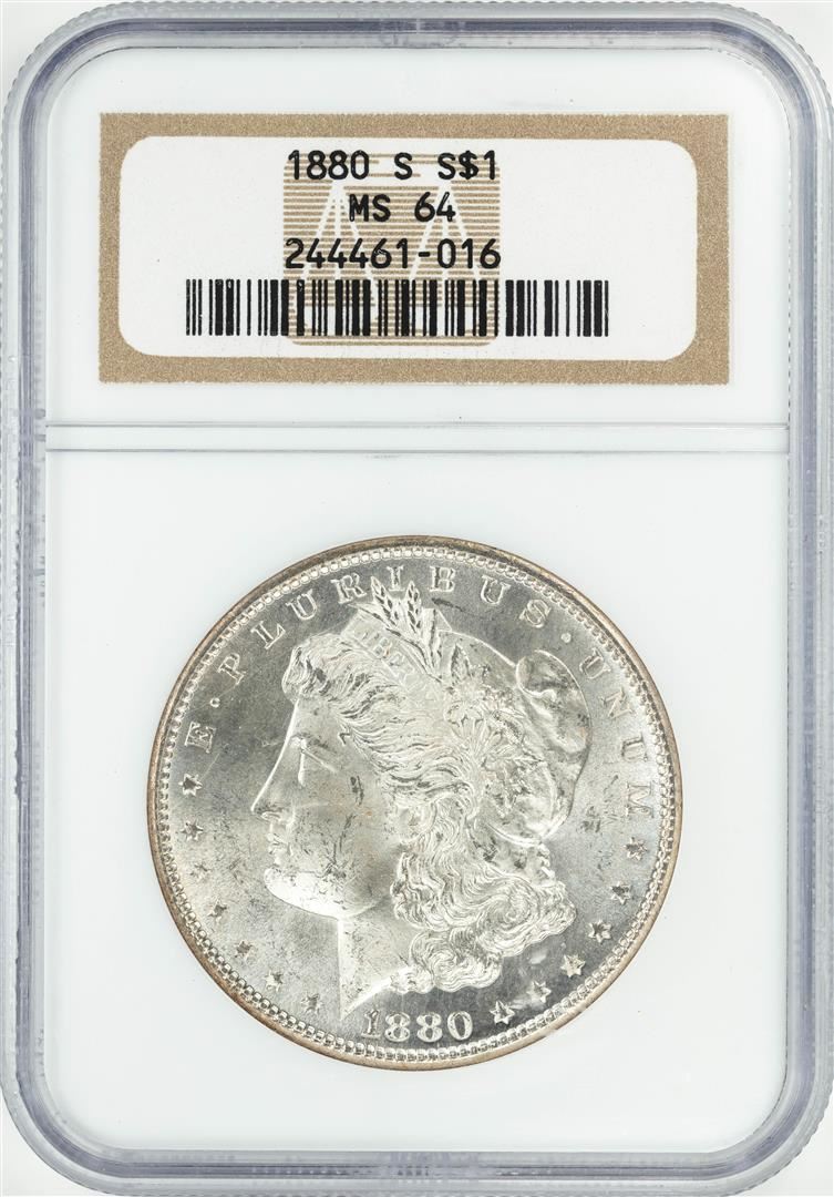 One 1880-S $1 Morgan Silver Dollar Coin NGC MS64. NGC Certified.