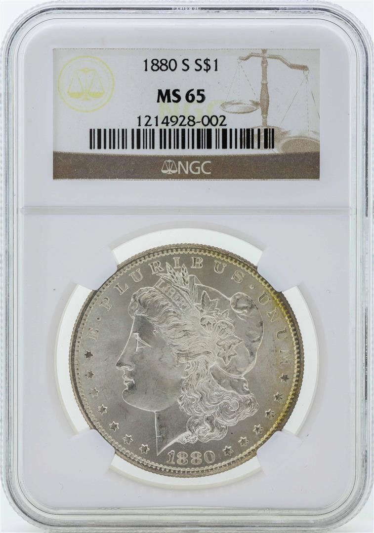 One 1880-S $1 Morgan Silver Dollar Coin NGC MS65. NGC Certified.