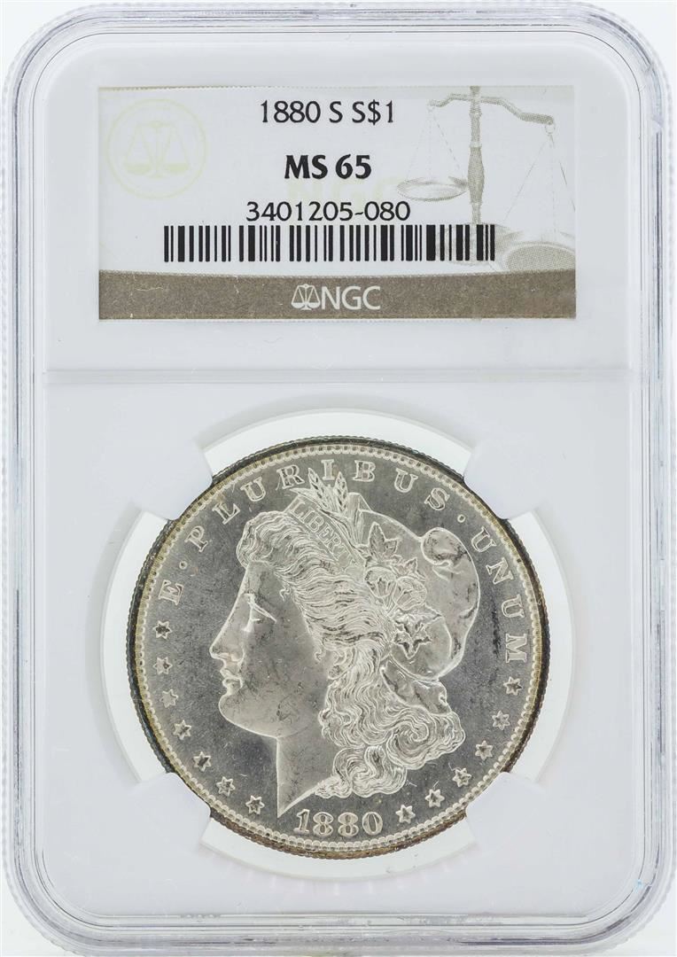 One 1880-S $1 Morgan Silver Dollar Coin NGC MS65. NGC Certified.