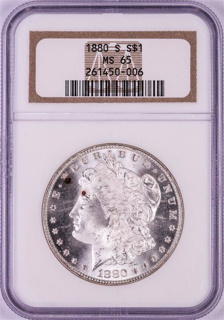 One 1880-S $1 Morgan Silver Dollar Coin NGC MS65. NGC Certified.