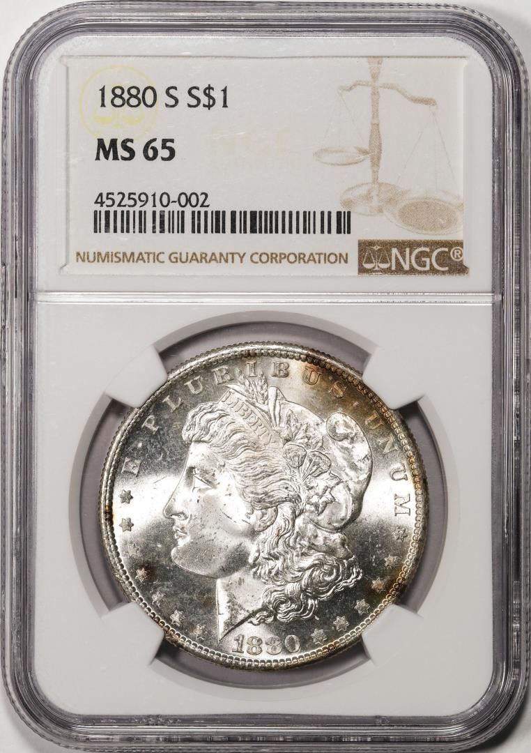 One 1880-S $1 Morgan Silver Dollar Coin NGC MS65. NGC Certified.