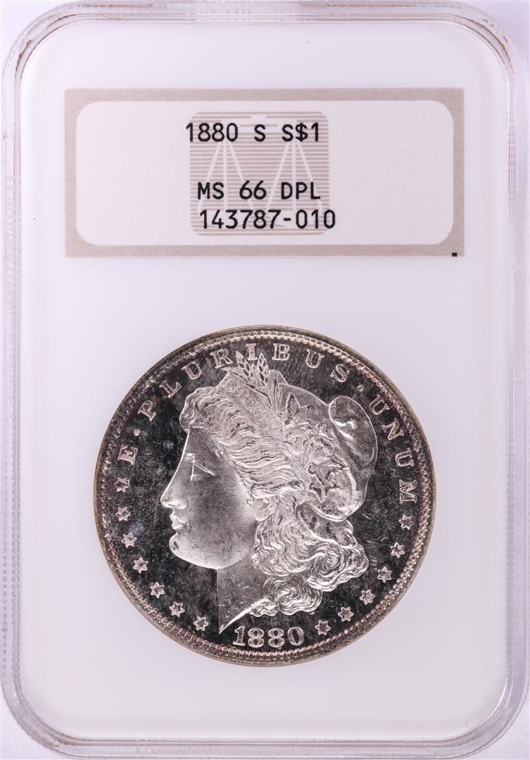 One 1880-S $1 Morgan Silver Dollar Coin NGC MS66 DPL. NGC Certified.