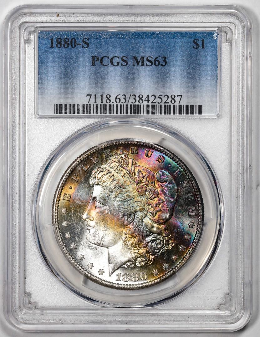 One 1880-S $1 Morgan Silver Dollar Coin PCGS MS63 Amazing Toning. PCGS Graded.