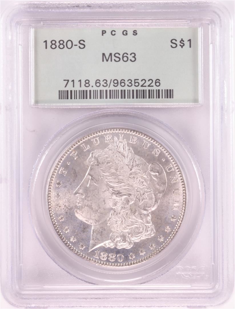 One 1880-S $1 Morgan Silver Dollar Coin PCGS MS63 Old Green Holder. PCGS Graded.