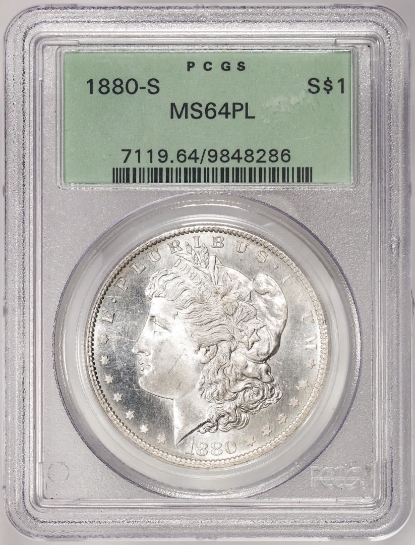 One 1880-S $1 Morgan Silver Dollar Coin PCGS MS64PL Old Green Label. PCGS Graded.