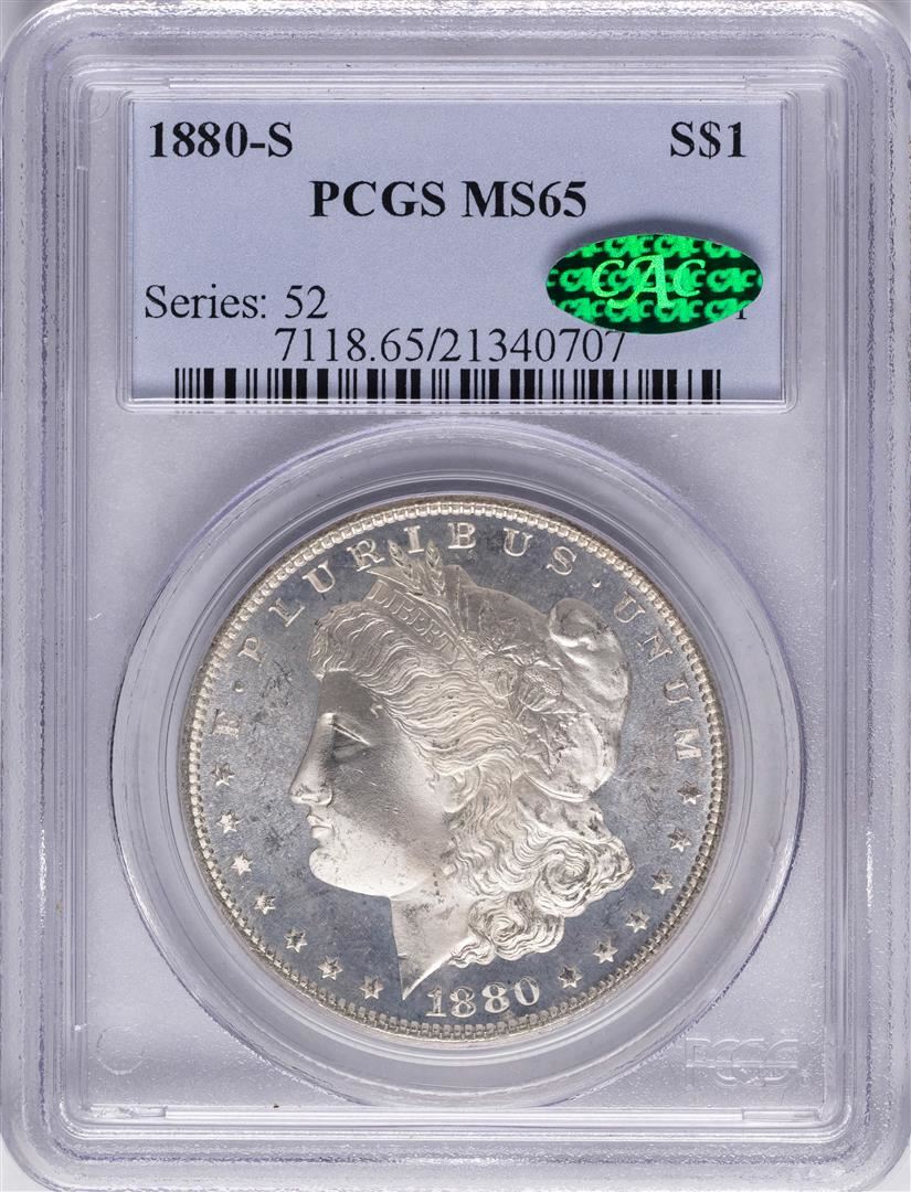 One 1880-S $1 Morgan Silver Dollar Coin PCGS MS65 CAC. PCGS Graded.