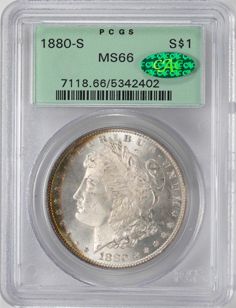 One 1880-S $1 Morgan Silver Dollar Coin PCGS MS66 CAC OGH Nice Toning. PCGS Graded.