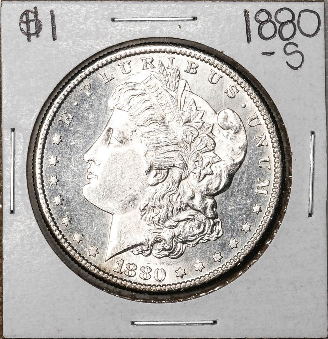 One 1880-S $1 Morgan Silver Dollar Coin.