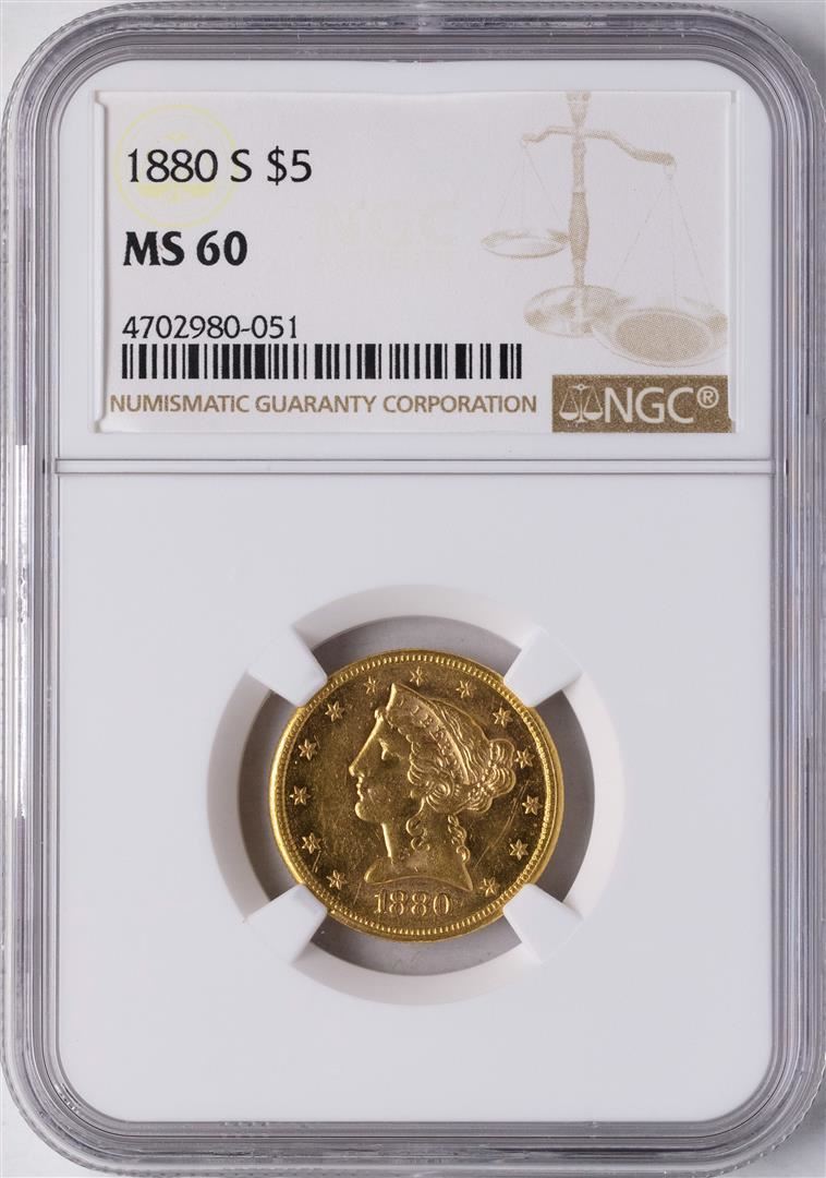 One 1880-S $5 Liberty Head Half Eagle Gold Coin NGC MS60. NGC Certified.