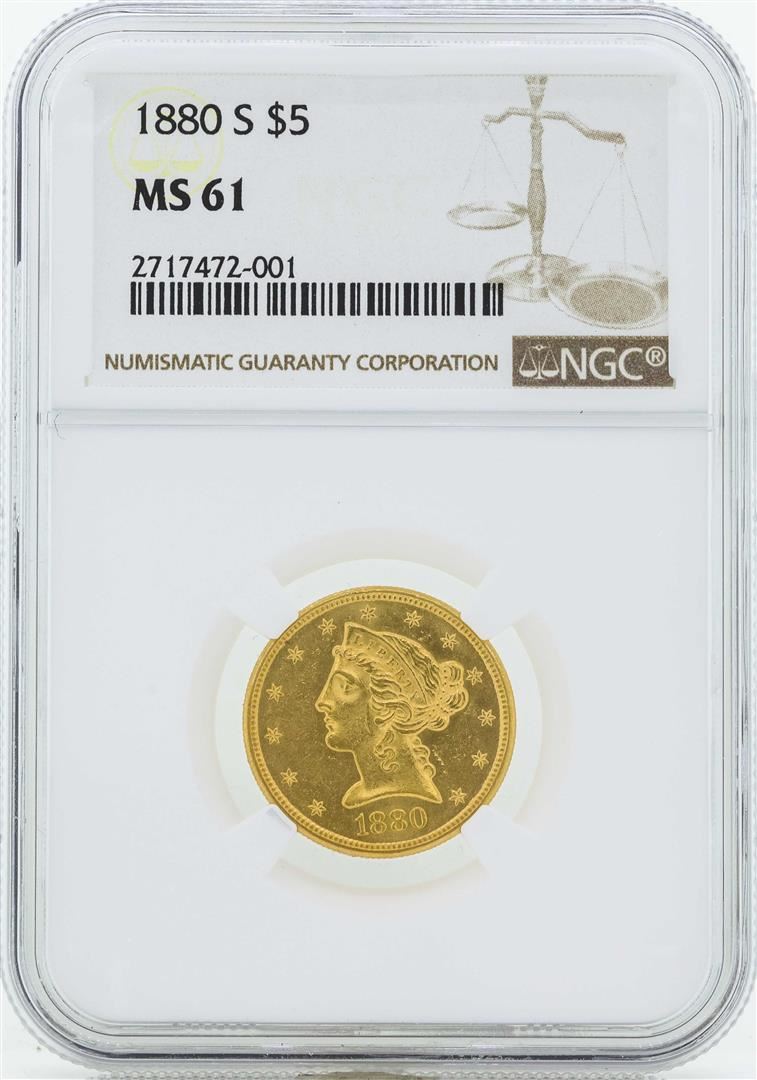 One 1880-S $5 Liberty Head Half Eagle Gold Coin NGC MS61. NGC Certified.