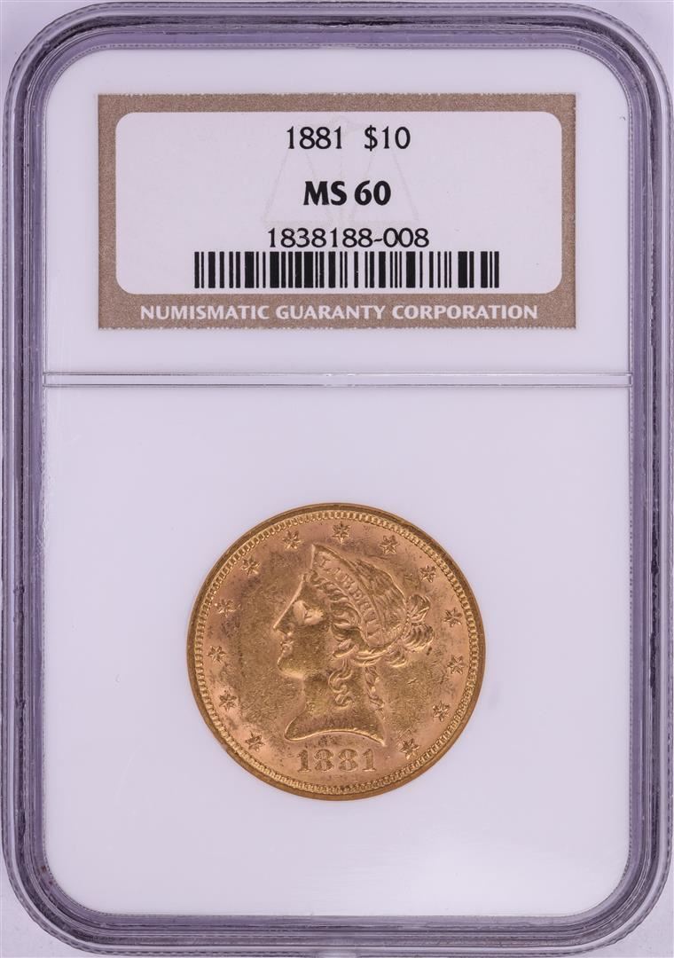 One 1881 $10 Liberty Head Eagle Gold Coin NGC MS60. NGC Certified.