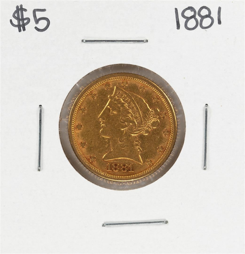 One 1881 $5 Liberty Head Eagle Gold Coin.