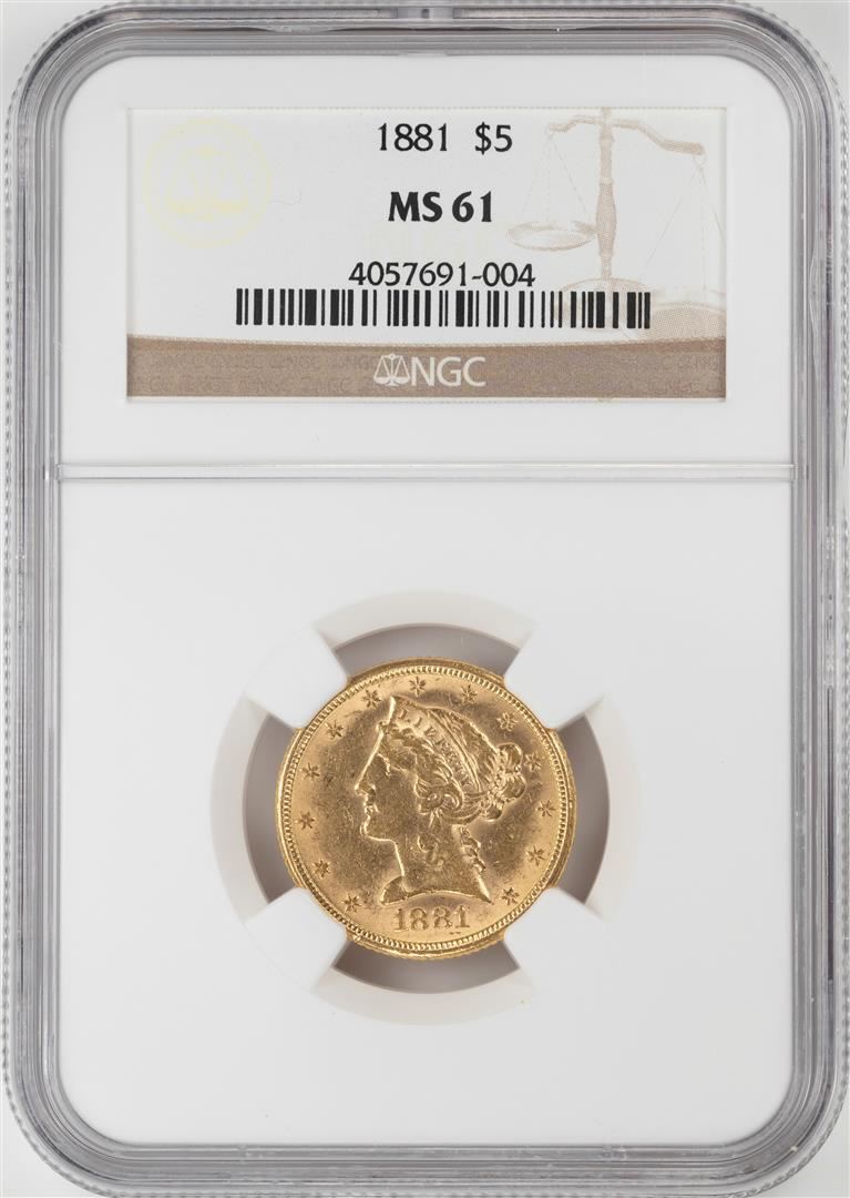 One 1881 $5 Liberty Head Half Eagle Gold Coin NGC MS61. NGC Certified.