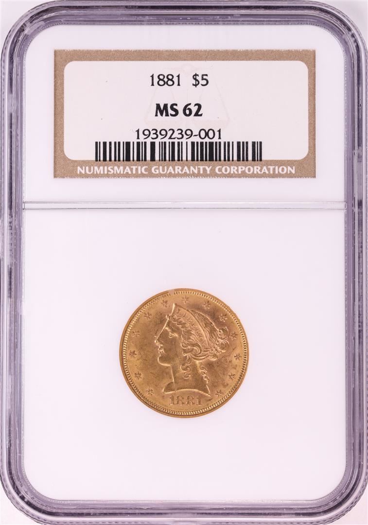 One 1881 $5 Liberty Head Half Eagle Gold Coin NGC MS62. NGC Certified.