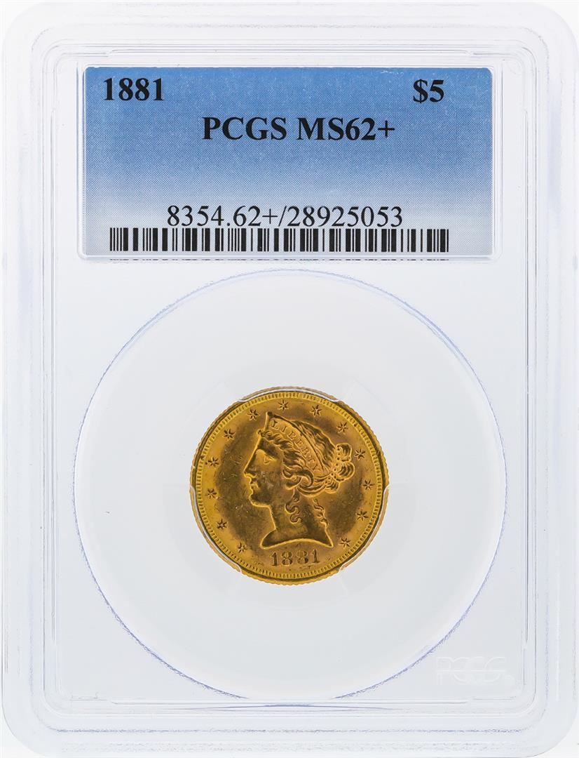 One 1881 $5 Liberty Head Half Eagle Gold Coin PCGS Graded MS62+. PCGS Graded.