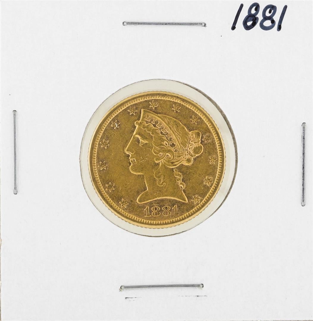 One 1881 $5 Liberty Head Half Eagle Gold Coin.