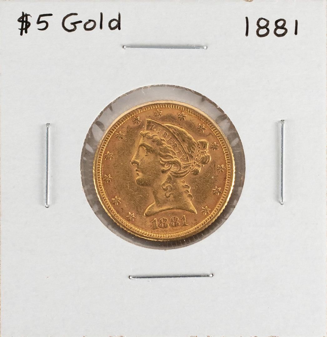 One 1881 $5 Liberty Head Half Eagle Gold Coin.