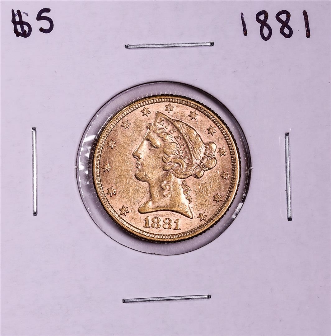 One 1881 $5 Liberty Head Half Eagle Gold Coin.