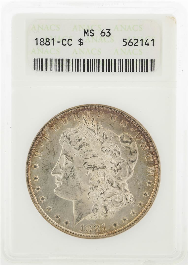 One 1881-CC $1 Morgan Silver Dollar Coin ANACS MS63. ANACS Certified.