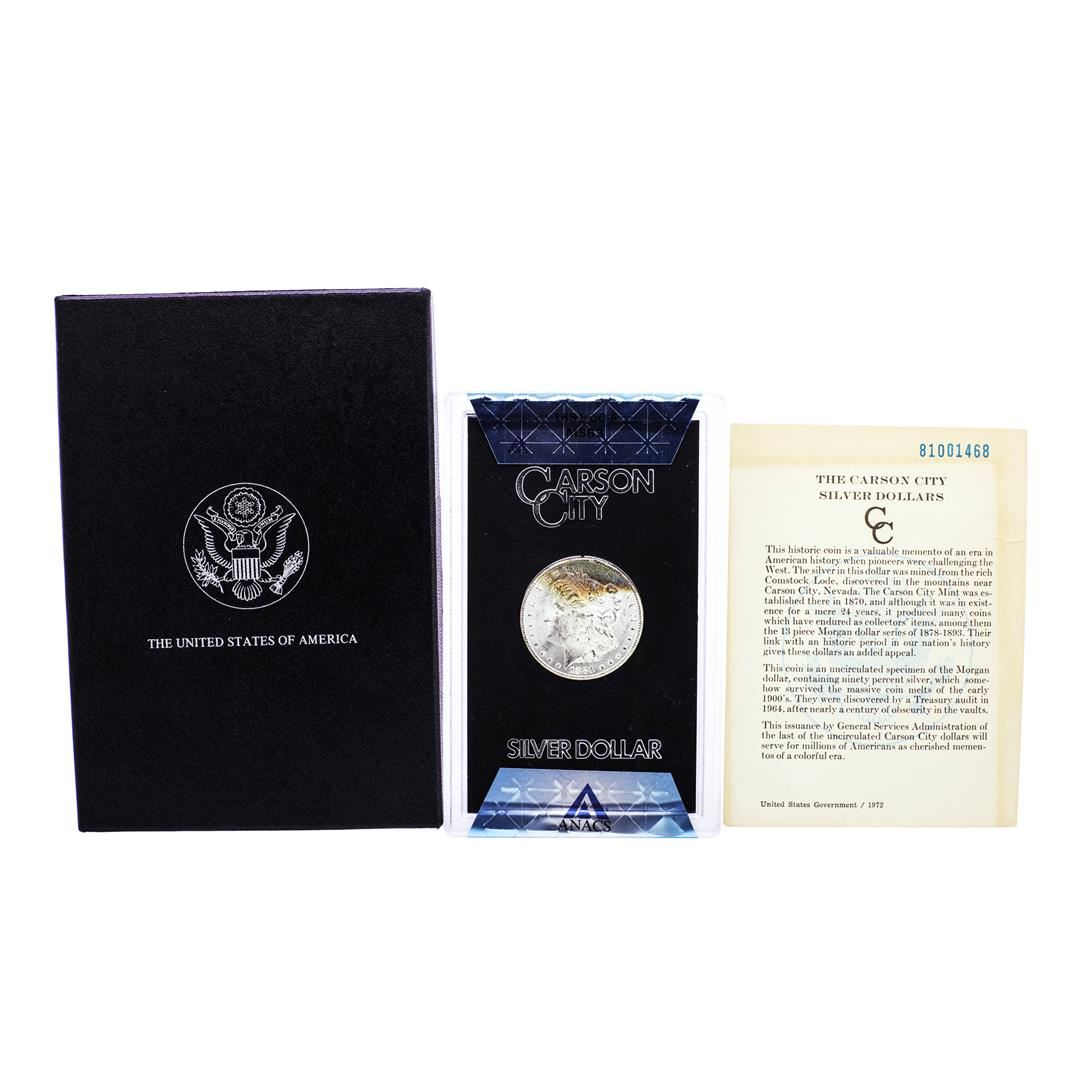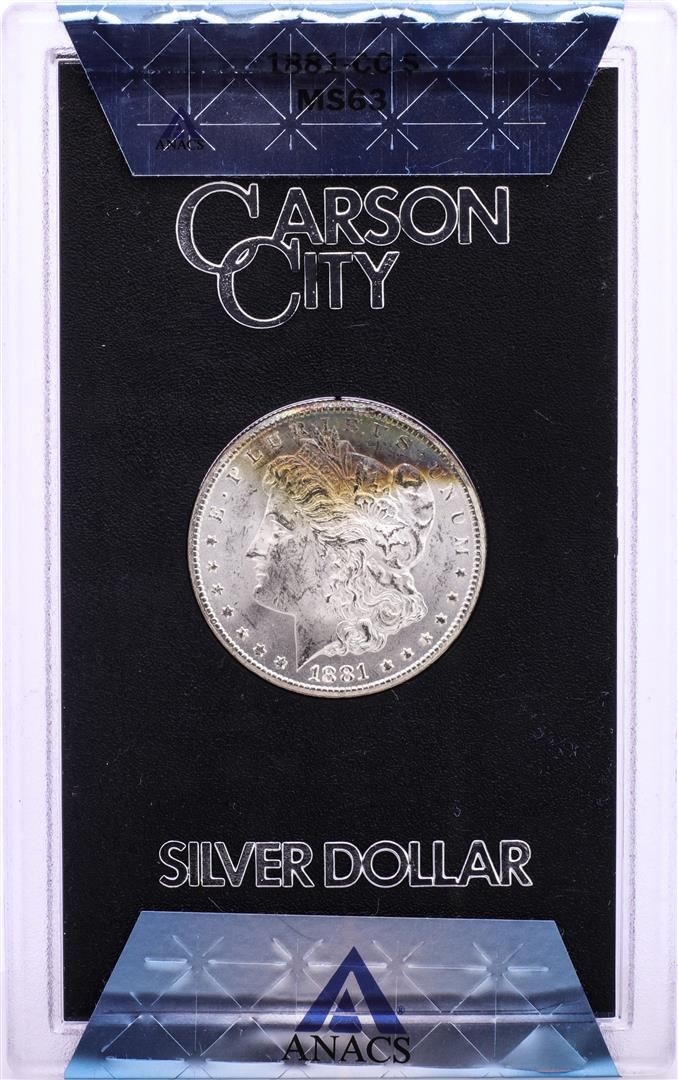 One 1881-CC $1 Morgan Silver Dollar Coin GSA Hoard ANACS MS63 w/Box & COA Amazing Toning. ANACS Certified.