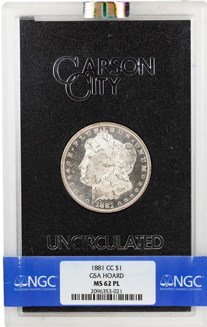 One 1881-CC $1 Morgan Silver Dollar Coin GSA Hoard Uncirculated NGC MS62 PL. NGC Certified.