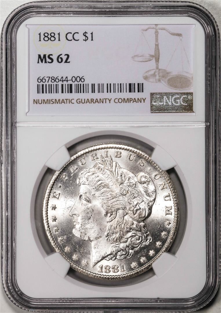 One 1881-CC $1 Morgan Silver Dollar Coin NGC MS62. NGC Certified.