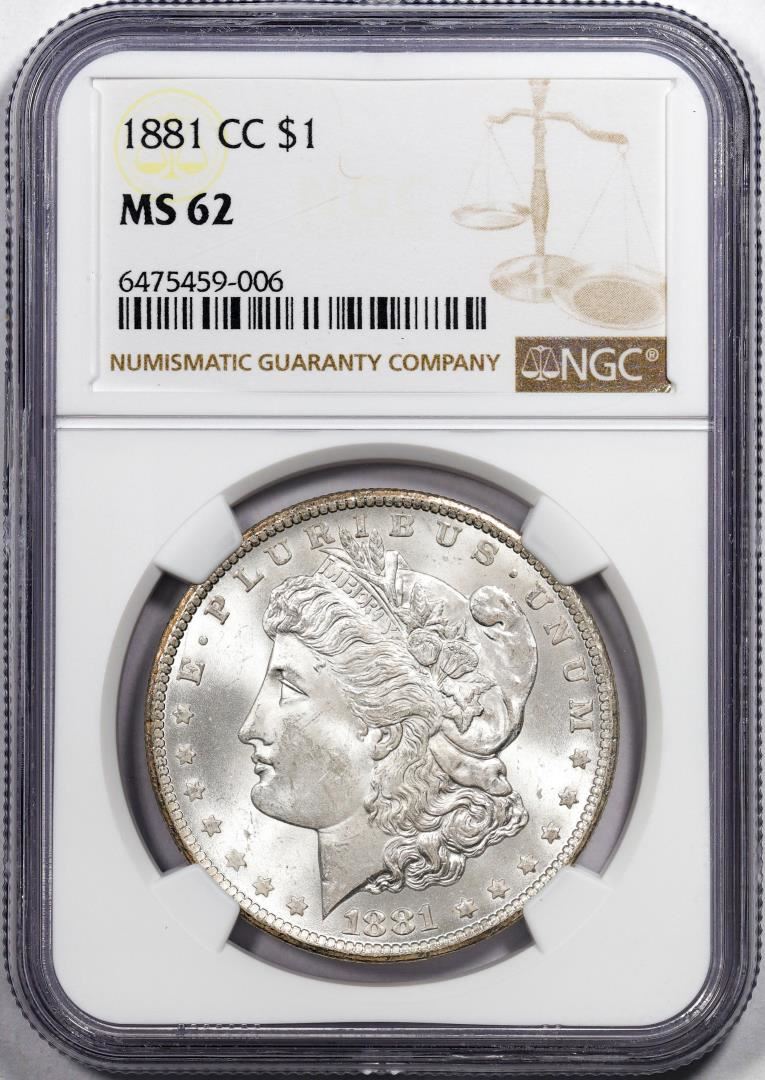 One 1881-CC $1 Morgan Silver Dollar Coin NGC MS62. NGC Certified.